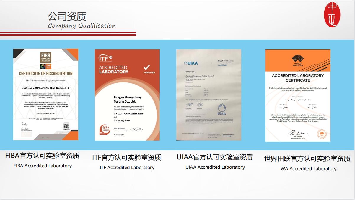 江苏中正检测股份有限公司作为国际田联IAAF、国际篮联FIBA、国际网联ITF、国际登联UIAA、国际羽联BWF、国际足联FIFA、国际手联IHF等体育场馆项目亚太区技术服务合作伙伴,江苏中正检测股份有限公司在中国区建立官方认可实验室,为亚太地区提供公正、科学、安全、健康、环保的检测认证服务。