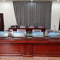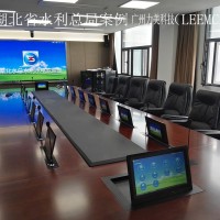 方案:嵌入式液晶屏升降器+可调向鹅颈话筒+智能反馈抑制器,超薄屏体与桌面融合